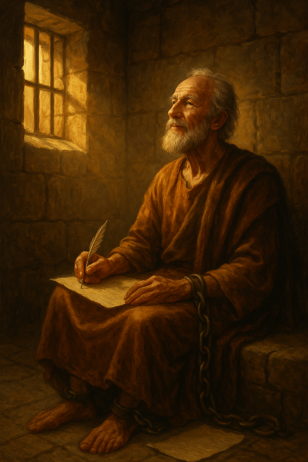 Light slipped through the narrow cracks between stone and iron, painting faint gold bars across the walls. Chains clinked softly as the old apostle shifted, his body worn but his spirit unbroken.